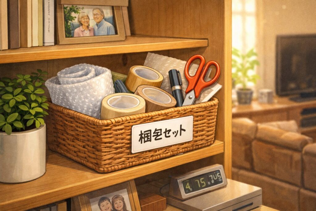 おすすめは、リビングの片隅や玄関付近に、梱包に必要な道具を全てまとめた「発送専用カゴ」を作ることです。