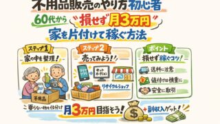 不用品販売の始め方(基礎) 不用品販売のやり方初心者|60代から“損せず月3万円”家を片付けて稼ぐ方法 不用品販売のやり方を、定年後の初心者向けに優しく解説!スマホ1台で家を片付けながら、無理なくお小遣い稼ぎを始める3ステップ。60代・70代でも安心の音声入力術や、重い荷物も持たずに送れる最新発送サービスも紹介。 2026.04.04 不用品販売の始め方(基礎)