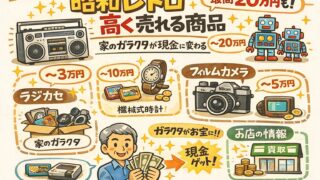 売れる不用品ジャンル特化 昭和レトロ高く売れる商品【最高20万円も】家のガラクタが現金に変わる 昭和レトロで高く売れる商品は?定年後の片付けで見つかるお宝10選をプロが解説。カメラ、玩具、生活雑貨など、捨てればゴミ、売れば軍資金に!60代・70代でも失敗しない簡単な売り方と高く売るコツを網羅しました。 2026.04.11 売れる不用品ジャンル特化