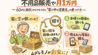 不用品販売の始め方(基礎) 不用品販売で月1万円|60代からでもできた「家の中の埋蔵金」の見つけ方 不用品販売で月1万円!定年後の家を片付けながら、無理なくお小遣いを得る手順を60〜70代の方向けに易しく解説。スマホ出品のコツから、昭和のお宝リスト、匿名配送の仕組みまで。家も心も軽くなる新習慣を始めましょう。 2026.04.07 不用品販売の始め方(基礎)