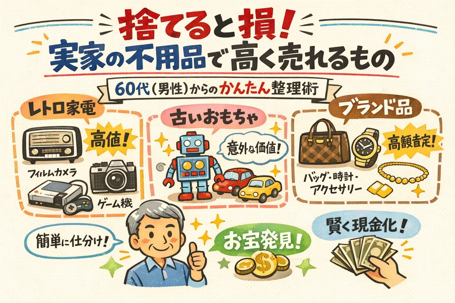 この記事では、実家の片付けで遭遇しやすい「実は高く売れるもの」を、最新の市場動向に基づき分かりやすくリストアップしました。あわせて、「フリマアプリは操作が難しい」「重いものを運ぶ体力に自信がない」という方でも、座ったままラクに、そして確実にお金に換えるための具体的な解決策をお伝えします。